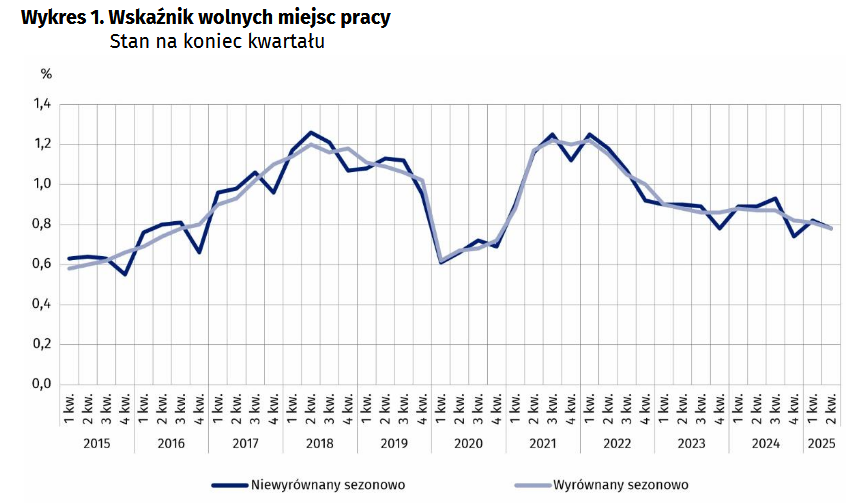 “W Polsce na koniec II kwartału 2025 r. było o 5,2% mniej wolnych miejsc pracy niż na koniec poprzedniego kwartału, a wskaźnik wolnych miejsc pracy zmniejszył się o 0,04 p. proc. do 0,78%” – przeczytamy w raporcie GUS. Oznacza to, że udział wolnych miejsc pracy w sumie całkowitej (obsadzonych i wolnych miejsc pracy) zmniejszył się.
