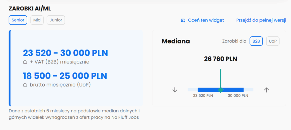 Dane z portalu NoFluff Jobs dotyczące zarobków specjalistów oraz dyrektorów odpowiadających za AI/ML (sztuczna inteligencja, machine learning).