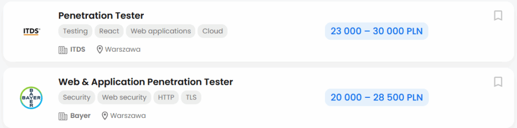 Dane z portalu NoFluff Jobs dotyczące zarobków testerów penetracyjnych (osoba odpowiedzialna za przeprowadzanie kontrolowanych ataków na systemy, sieci i aplikacje, w celu zidentyfikowania luk bezpieczeństwa).
