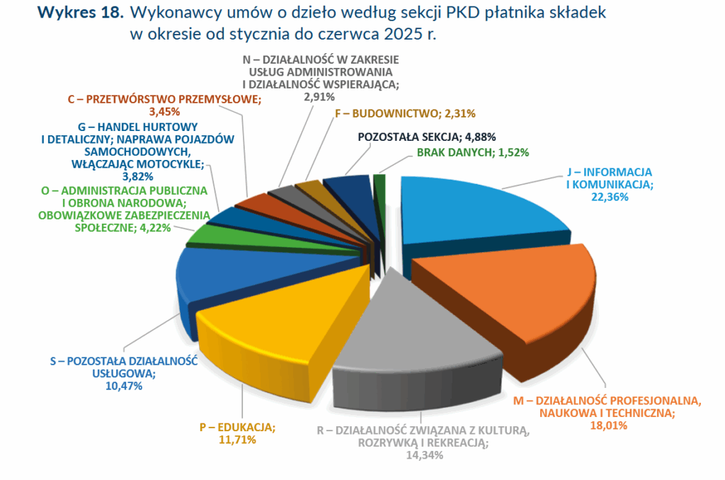 Sektory, które najsilniej korzystają z tej elastyczności, to przede wszystkim branże kreatywne i innowacyjne. Liderami są: informacja i komunikacja (22,36 proc. umów), działalność profesjonalna, naukowa i techniczna (18,01 proc. umów) oraz kultura, rozrywka i rekreacja (14,34 proc.).