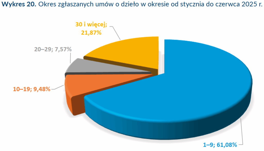 Charakterystyka czasowa umów o dzieło wyraźnie potwierdza ich projektowe i często jednorazowe zastosowanie. Aż 28,28 proc. wszystkich umów zawarto na zaledwie jeden dzień, a kolejne 7,19 proc. na dwa dni. Ten wysoki odsetek zleceń błyskawicznych skutkuje tym, że mediana długości trwania umowy wynosi zaledwie 6 dni. Oznacza to, że ponad połowa UoD ma charakter skrajnie krótkoterminowy.