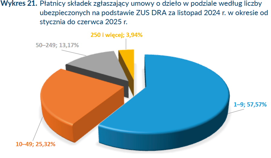 Analiza struktury płatników składek bezsprzecznie wskazuje, że umowa o dzieło (UoD) jest zjawiskiem dominującym w segmencie najmniejszych przedsiębiorstw. Aż 57,57 proc. podmiotów zgłaszających umowy o dzieło to mikrofirmy, zatrudniające do 9 ubezpieczonych.