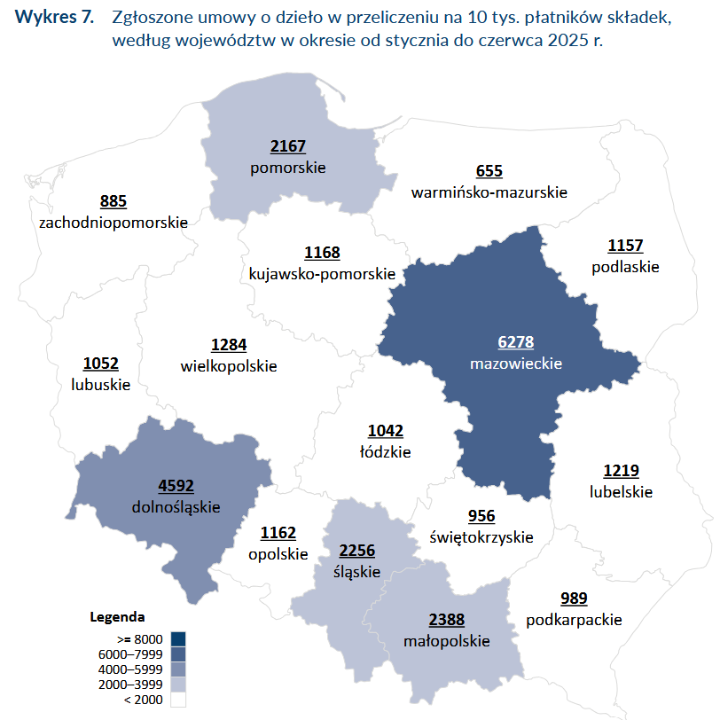 Najgorzej wypada województwo warmińsko-mazurskie. Tutaj liczba zgłoszonych umów (655 na 10 tys. płatników) oraz liczba wykonawców (48 na 10 tys. ubezpieczonych) są najniższe ze wszystkich regionów.