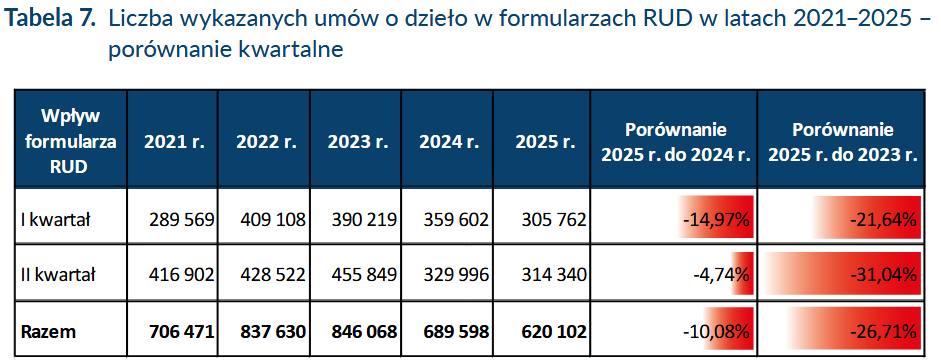 Rejestr umów o dzieło (RUD) za I półrocze 2025 r., opublikowany przez Zakład Ubezpieczeń Społecznych (ZUS), pokazuje, że mamy do czynienia z dużym spadkiem liczby zgłoszeń. Forma ta dalej pozostaje wygodnym narzędziem elastycznego zarządzania zasobami, zwłaszcza w sektorze mikro i małych przedsiębiorstw (MŚP). W ciągu pierwszych sześciu miesięcy 2025 r. zgłoszono ponad 620,1 tys. umów o dzieło, które stanowią często krótkoterminową odpowiedź na pilne potrzeby projektowe firm.