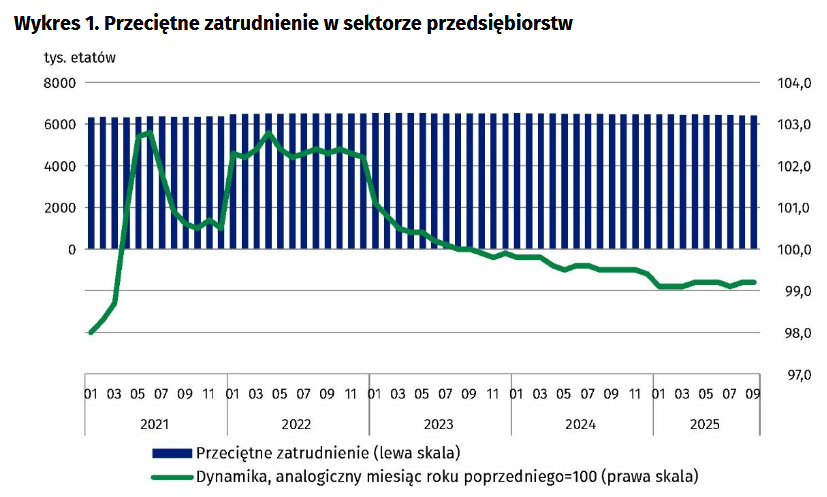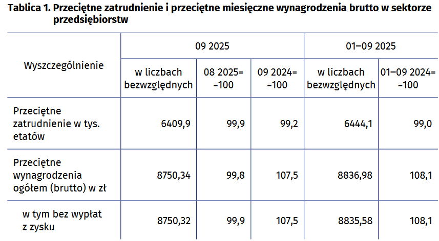 Rynek pracy w sektorze przedsiębiorstw we wrześniu 2025 roku charakteryzował się stabilnym wzrostem płac przy jednoczesnym, umiarkowanym spadku zatrudnienia. Główny Urząd Statystyczny (GUS) podał, że przeciętne wynagrodzenie brutto wzrosło o 7,5 proc. rok do roku (rdr), osiągając kwotę 8 750,34 zł. Jednocześnie zatrudnienie w tym samym sektorze zanotowało spadek o 0,8 proc. rdr.