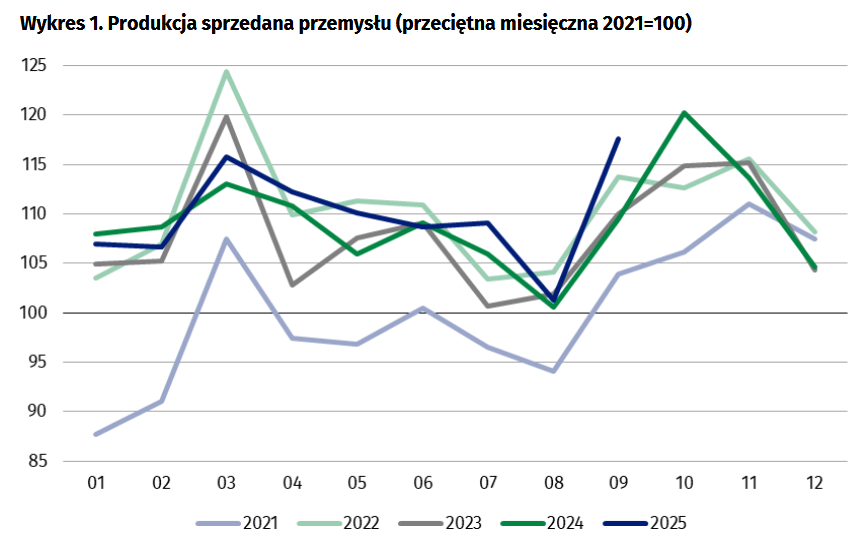 “Wrześniowa produkcja przemysłowa wzrosła o 7,4% r/r – mocno powyżej oczekiwań. To solidny sygnał odbicia po słabym sierpniu i dowód, że ożywienie w przetwórstwie naprawdę nabiera tempa. Dodatkowy dzień roboczy pomógł, ale skala wzrostu i tak zaskakuje – wzrost m/m wyniósł 4,1%!” – informują optymistycznie ekonomiści PKO BP.