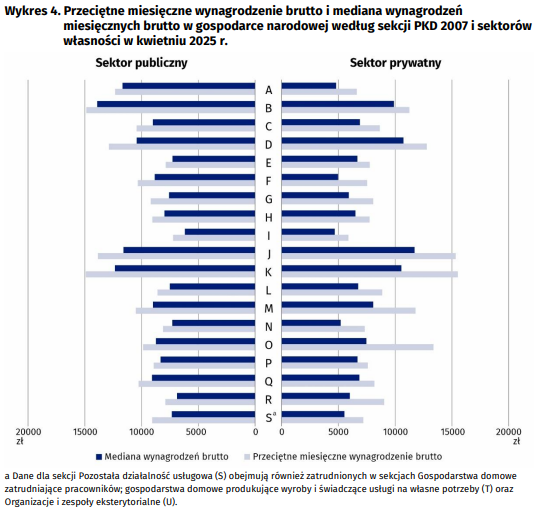 Najwyższe mediany notowano w górnictwie i wydobywaniu – 12 613 zł, a także w sektorze informacji i komunikacji, gdzie w firmach prywatnych mediana sięgnęła 11 709 zł. Największe różnice płac między płciami utrzymywały się w finansach i ubezpieczeniach – sięgały ponad 35 proc. na korzyść mężczyzn. W budownictwie odwrotnie – kobiety zarabiały średnio o ponad jedną trzecią więcej niż mężczyźni.