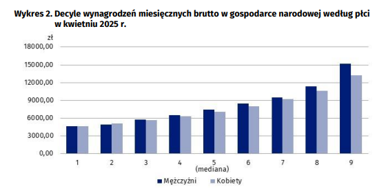 Rozbieżności są szczególnie wyraźne w najwyższym decylu, gdzie najlepiej zarabiający mężczyźni osiągali zarobki powyżej 15 232 zł, podczas gdy kobiety – powyżej 13 272 zł.