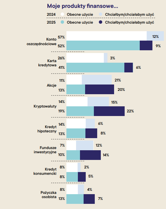 Z badania wynika, że znacząco wzrósł odsetek osób korzystających z kart kredytowych – z 26% w ub.r. do 41% w 2025 r. Więcej osób też inwestuje w akcje, kryptowaluty czy fundusze inwestycyjne.