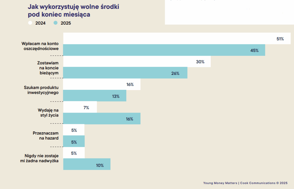 Co ciekawe 16% badanych wydaje nadwyżkę finansową na styl życia, co jest wzrostem aż o 11% w porównaniu z 2024 rokiem. Czy to oznacza, że ta grupa młodych nie myśli o zabezpieczeniu finansowym, czy też doszła do wniosku, że skoro ich oszczędności byłyby niewielkie, lepiej wydać je na bieżąco na lepszy styl życia? Tego nie wiemy.