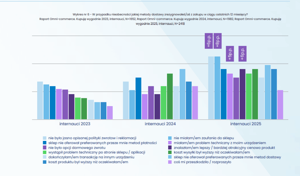 Główny powód to brak oczekiwanej formy dostawy lub zbyt wysoki koszt dostarczenia przesyłki. Współczesny klient chce otrzymać zakupy szybko. Z możliwością odbioru tam, gdzie akurat będzie przebywał, dlatego największą popularnością cieszą się paczkomaty. Zależy mu też na łatwym i sprawnym zwrocie z jasnymi zasadami.