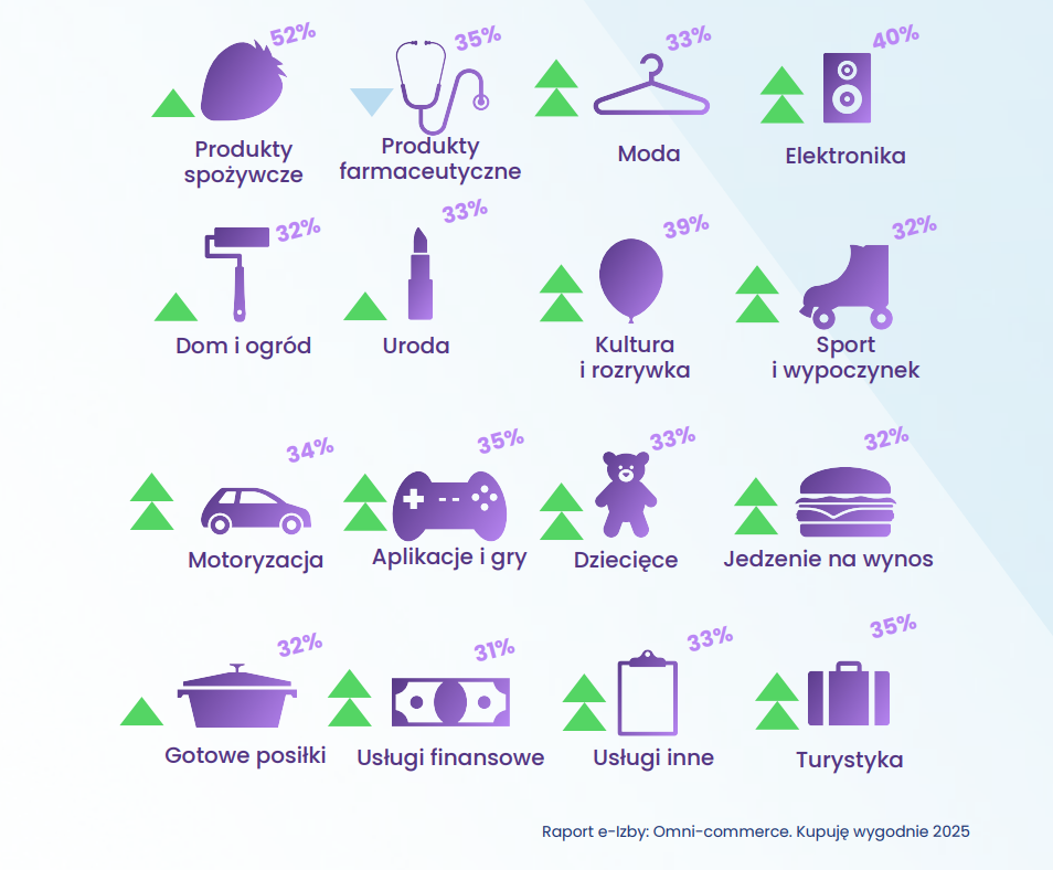Podobnie jak w roku 2024 żywność była topową kategorią kupowaną online. 52% badanych osób wskazało tę kategorię, co oznacza wzrost o +4p.p. do zeszłego roku. Na drugim miejscu była elektronika, wskazało ją 40% respondentów. Za nią była kultura i rozrywka. Następnie na tym samym miejscu turystyka, aplikacje i gry oraz produkty farmaceutyczne. Te ostatnie, jako jedyna kategoria, odnotowały spadek – o -7p.p.