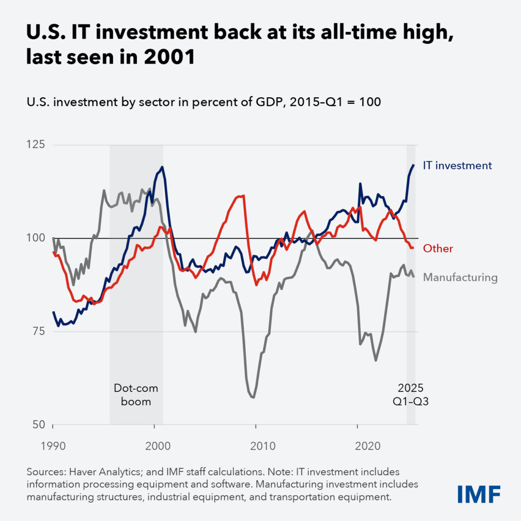 MFW w swojej analizie powraca do lekcji z lat 1995–2000, czyli ery boomu dot-comów (bańka internetowa). Choć obecna skala inwestycji w IT w stosunku do PKB jest zbliża do tej sprzed 25 lat, eksperci dostrzegają istotne różnice. Dzisiejszy wzrost jest bardziej stopniowy, a wyceny giełdowe – choć wysokie – są poparte realnymi, solidnymi zyskami przedsiębiorstw.