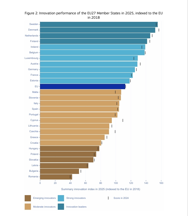 Unijna “tablica wyników innowacyjności” dzieli państwa członkowskie na cztery ligi: liderów, silnych, umiarkowanych oraz wschodzących innowatorów. Polska wciąż gra w tej ostatniej – plasując się co prawda tuż za Węgrami jako druga w grupie wschodzących innowatorów, ale dopiero na 23. miejscu w całej UE.