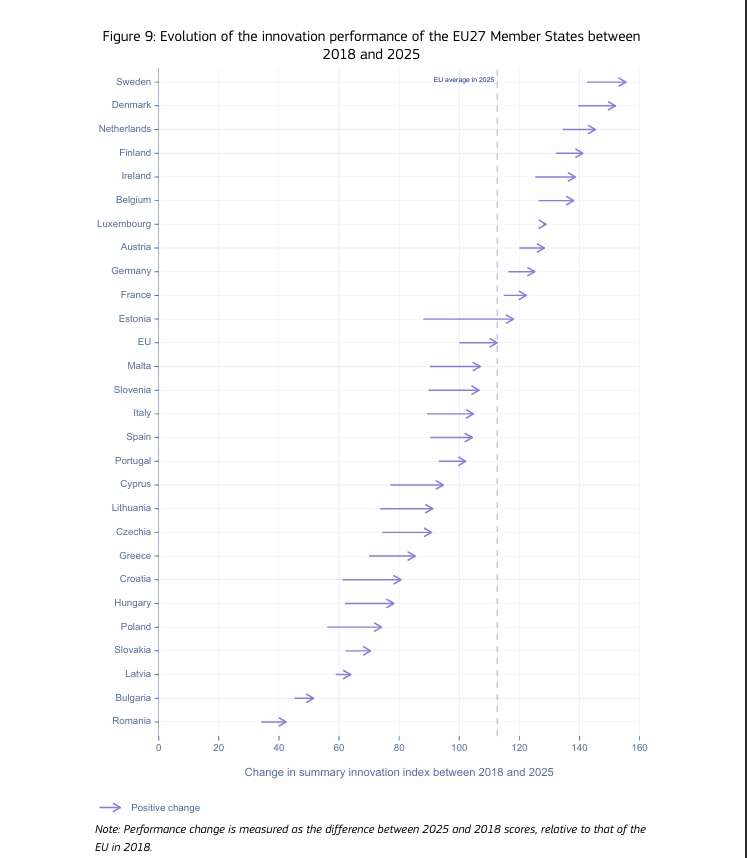 Choć wszystkie kraje UE poprawiły swoje wyniki innowacyjności w ciągu ostatnich siedmiu lat, niektóre państwa odnotowały – jak podkreślono w raporcie – “wyraźnie silniejsze postępy, znacznie powyżej średniej”. Największy skok – o 30 punktów – w tegorocznej edycji rankingu zanotowała Estonia. Sukcesem może pochwalić się także Chorwacja, która poprawiła wynik o 19,4 punktu, przechodząc z kategorii wschodzących do umiarkowanych innowatorów.