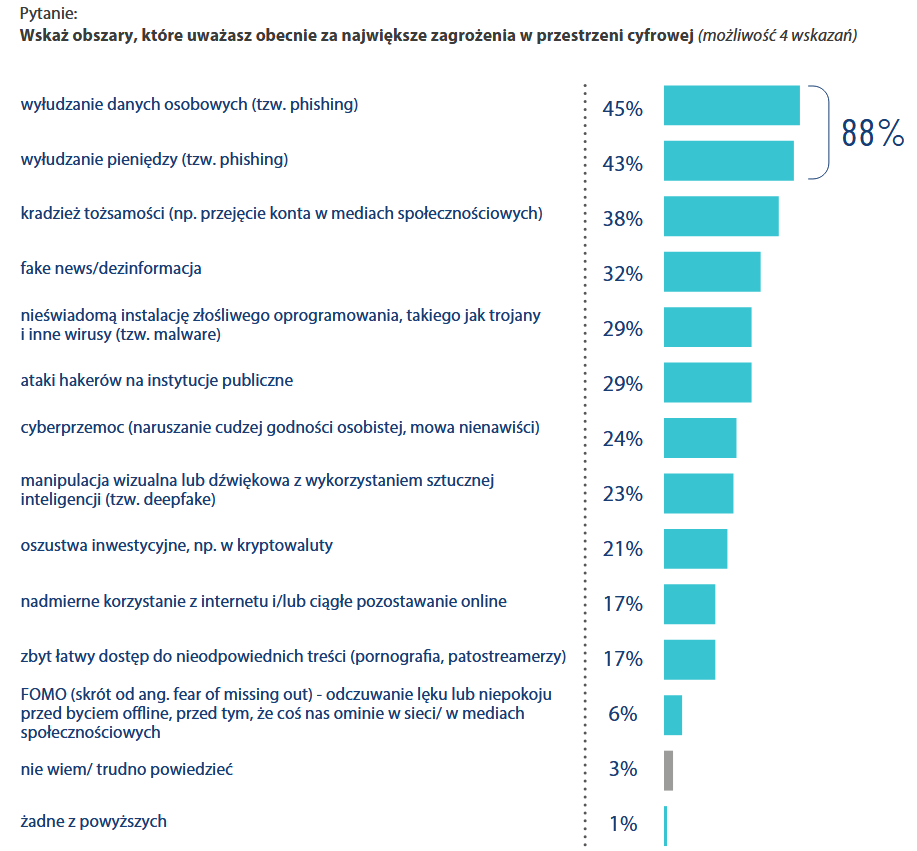 W tym samym czasie bardzo jasno deklarujemy na co musimy uważać najbardziej. Aż 88 proc. respondentów uważa phishing za największe zagrożenie w świecie cyfrowym. Na drugim i trzecim miejscu w rankingu internetowych niebezpieczeństw stanęły kradzież tożsamości (38 proc.) i dezinformacja (32 proc.).
