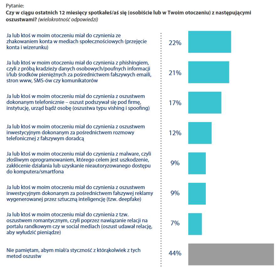“Co ciekawe, oszustw inwestycyjnych za pośrednictwem rozmowy telefonicznej z fałszywym doradcą doświadczają najczęściej osoby w wieku 35-44 lata (16 proc.), a poprzez deepfake (np. fałszywe reklamy intratnej i szybkiej inwestycji) – najmłodsi badani w wieku 18-24-lat (17 proc.)” – czytamy w raporcie.
