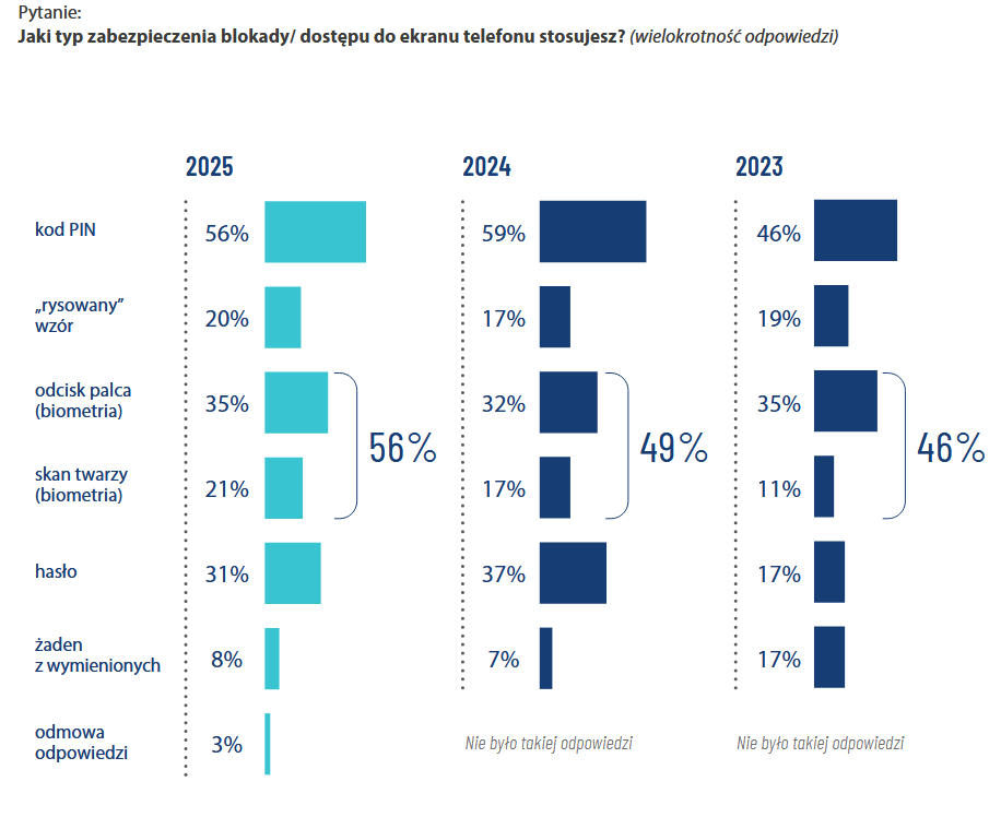 “Mimo, że Polacy nadal najczęściej wybierają kod PIN jako zabezpieczenie dostępu do swoich smartfonów (56 proc. badanych stosuje taką metodę), to w tegorocznym badaniu okazuje się, że tyle samo odblokowuje je za pomocą technologii biometrycznych (zarówno odciskiem palca jak i skanem twarzy)” – podkreślają autorzy badania.