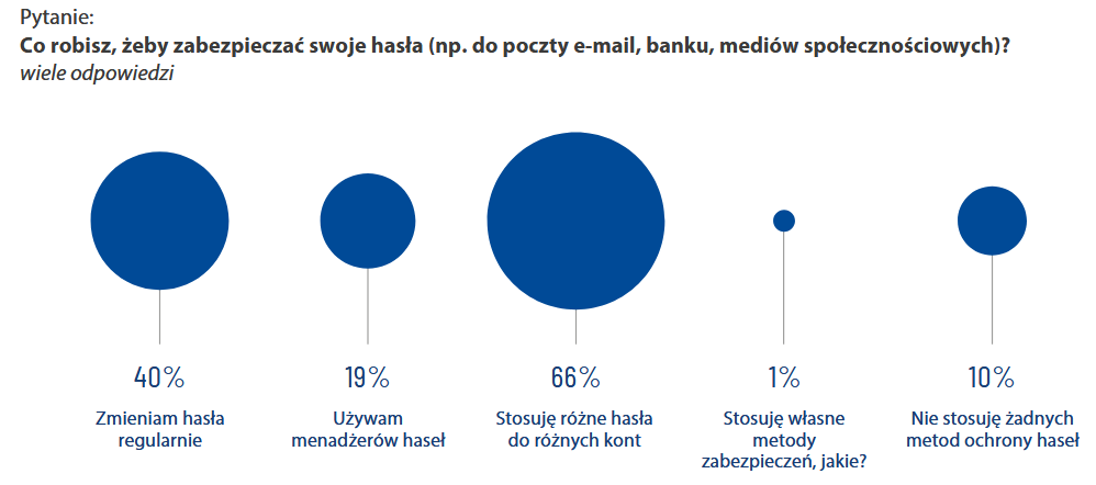 W przypadku haseł do telefonu lub aplikacji pozostajemy staromodni, ale staranni. Zaledwie 10 proc. badanych używa generatorów haseł, większość preferuje samodzielne tworzenie haseł skojarzeniowych (32 proc.) lub złożonych kombinacji liczb, liter i znaków (33 proc.). Aż 66 proc. respondentów stosuje różne hasła do kont, a 40 proc. dba o ich regularną zmianę.