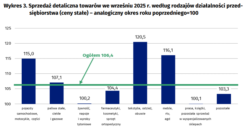 W okresie styczeń-wrzesień 2025 r. sprzedaż detaliczna wzrosła o 3,9 proc. rok do roku, wobec 2,6 proc. w analogicznym okresie ubiegłego roku. Po oczyszczeniu z wpływu czynników sezonowych sprzedaż była o 4,9 proc. wyższa niż rok temu, choć spadła o 0,6 proc. względem sierpnia.