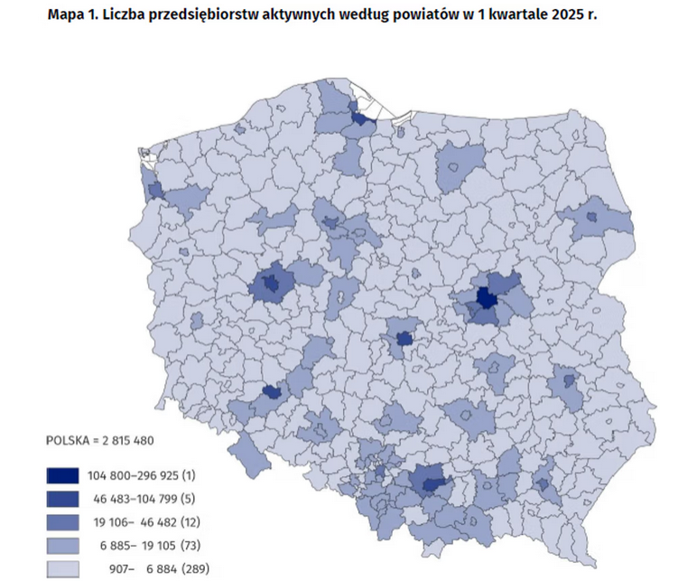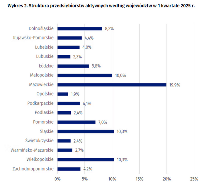 W pierwszym kwartale 2025 r. najwięcej przedsiębiorstw aktywnych miało siedzibę na terenie województwa mazowieckiego (19,9 proc.), wielkopolskiego (10,3 proc.), śląskiego (10,3 proc.) oraz małopolskiego (10 proc.), wynika z danych GUS.