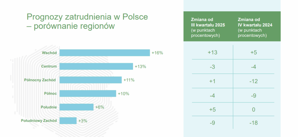Od października do końca grudnia 2025 r. wszystkie regiony Polski planują rekrutacje. Jednak różnice są spore. Na Wschodzie Polski zatrudnienie wzrośnie o 16%, a na południowym zachodzie tylko o 3%. Stąd między regionem oferującym największe zatrudnienie a tym z najmniejszą liczbą ofert różnica wynosi 13 p.p. Optymizm rekrutacyjny panuje też w Centrum (13%), na Północnym Zachodzie (11%) i Północy kraju (10%).
