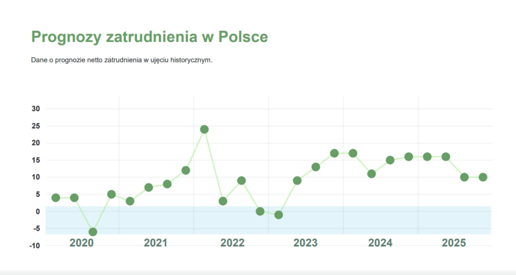 Jak wynika z badania, prognoza netto zatrudnienia w Polsce dla IV kwartału 2025 r. wynosi 10% i jest identyczna jak w III kwartale. Niepokoi jednak, że w ujęciu rocznym spadła o 6 p.p. Jest też dużo niższa od globalnej prognozy netto zatrudnienia, która w okresie od października do końca grudnia 2025 r. wynosi 23%.