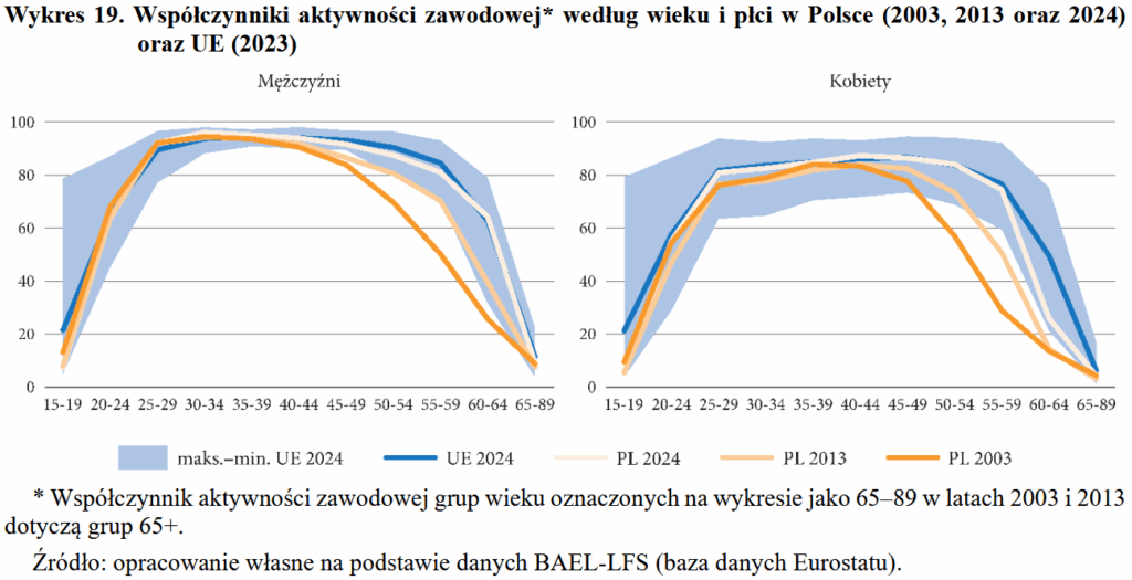 “W 2024 r. współczynnik aktywności zawodowej osób w wieku 15–64 lata wynosił 74,7%, co było jedynie nieznacznie poniżej średniej unijnej (75,3%). Szczegółowa analiza grup wieku i płci pokazuje, że choć aktywność zawo- dowa mężczyzn powyżej 20. roku życia oraz kobiet w wieku 25–59 lat w wielu przypadkach zbliżała się do średniej UE, a nawet ją przewyższała (np. wśród mężczyzn w wieku 25–29 lat), to nadal pozostaje znacznie niższa od najwyższych wartości notowanych w Europie” – czytamy w raporcie.