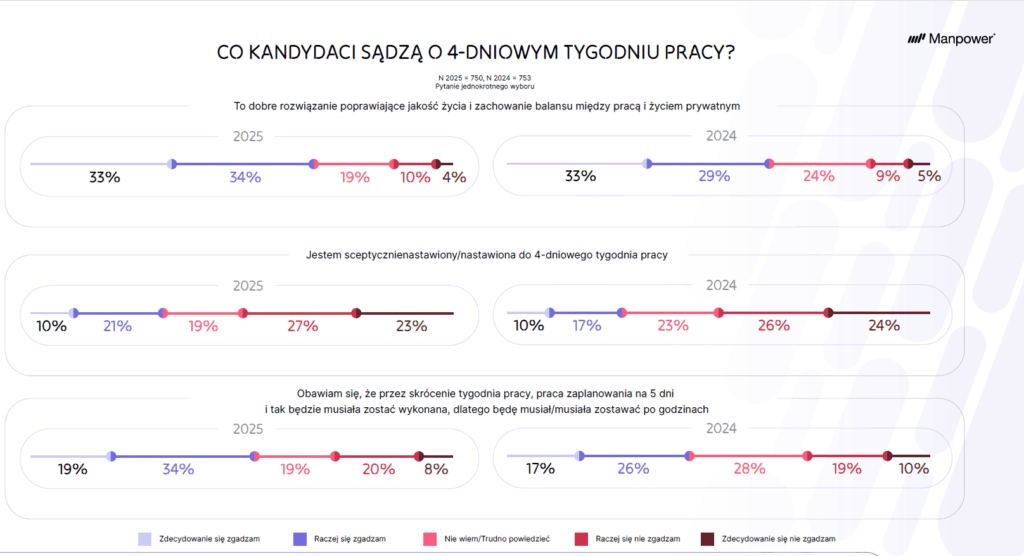 “Wyniki pokazują, że choć poparcie dla tego rozwiązania wciąż utrzymuje się na wysokim poziomie, tzn. powyżej 50%, w porównaniu z ubiegłym rokiem nieco osłabło. Może to świadczyć o pewnym zmęczeniu tematem od dłuższego czasu obecnym w debacie publicznej, ale bez realnych wdrożeń czy testów w większości organizacji” – komentuje cytowana w raporcie Katarzyna Gołek, specjalista Manpower.