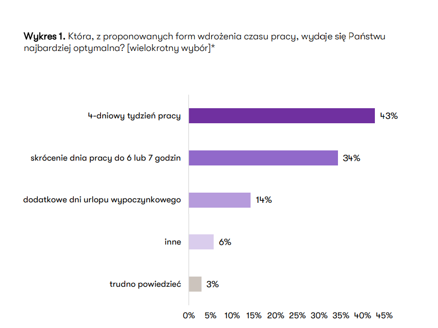 Ministerstwo Rodziny, Pracy i Polityki Społecznej pozostawiło wolną rękę firmom w kwestii sposobu przebiegania skróconego czasu pracy. Oznacza to, że pracodawca sam może zdecydować o formie. Z badania wynika, że największą przychylnością cieszy się model 4-dniowego tygodnia pracy. Tę opcję deklarowało 43% badanych, postrzegając ją za optymalną. 34% osób preferuje skrócenie dnia pracy do 6 lub 7 godzin.