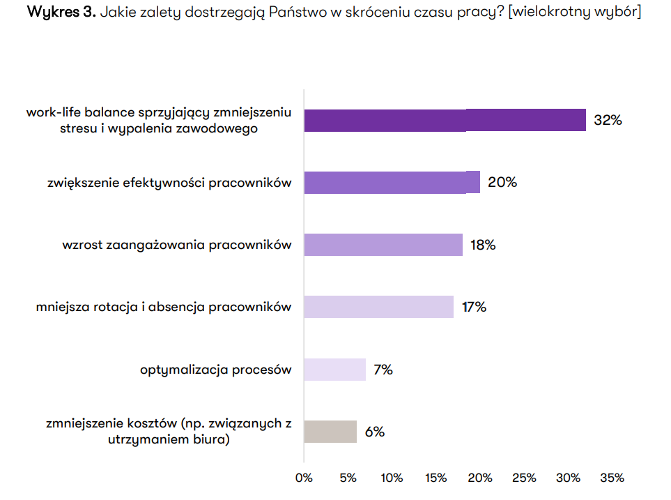 Pomimo trudności pracodawcy potrafią również dostrzec pozytywny aspekt skróconego czasu pracy. Najwięcej osób wskazało na work-life balance sprzyjający zmniejszeniu stresu i wypalenia zawodowego. Według badania serwisu LiveCareer.pl blisko co drugi Polak cierpi na wypalenie zawodowe, a aż 72% badanych zna kogoś, kogo dotyczy ten problem.