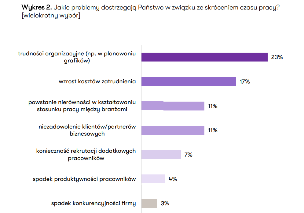 Kolejną dużą obawą jest wzrost kosztów zatrudnienia. Może to wynikać m.in. z perspektywy konieczności zatrudnienia dodatkowych osób. Pracodawcy obawiają się również niezadowolenia klientów/partnerów biznesowych oraz powstania nierówności w kształtowaniu stosunku pracy między branżami. Dlaczego?