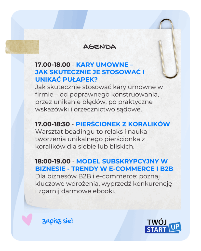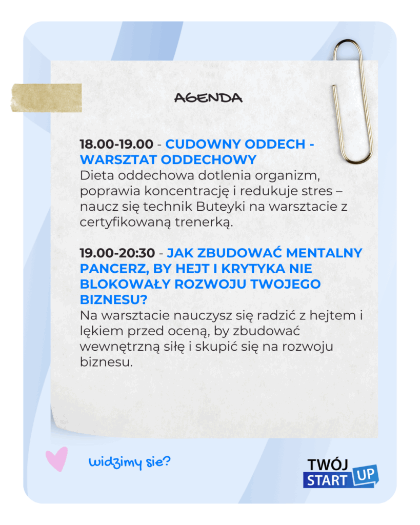 Od godziny 17 do 20:30 prowadzone będą praktyczne szkolenia. Będzie też można w swobodnej atmosferze wymienić się wiedzą z innymi i poszerzyć swoje kontakty biznesowe.