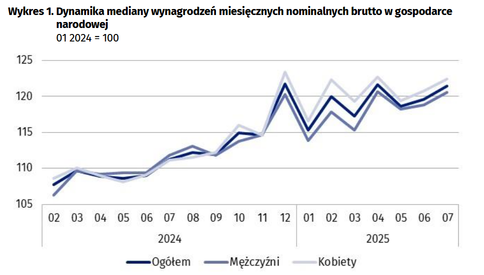 - w przypadku mężczyzn mediana wyniosła 7 447,27 zł, podczas gdy u kobiet było to 7 067,51 zł.