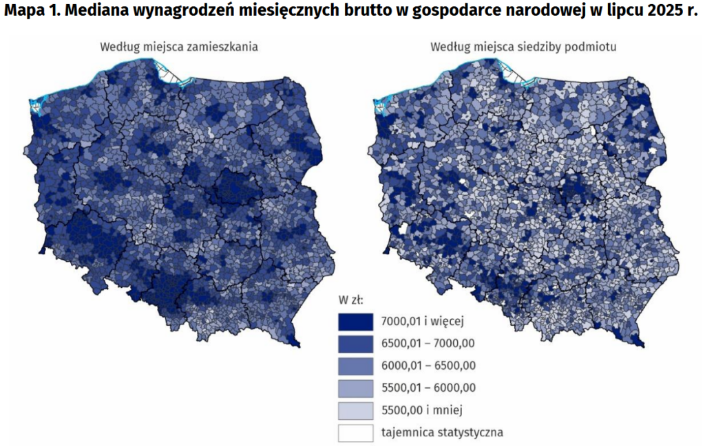 Różnice widać również na mapie kraju. W co piątej polskiej gminie (ok. 20 proc.) mediana wynagrodzeń nie przekracza 5,5 tys. zł brutto. Z kolei tylko w co czwartej gminie mediana jest równa lub wyższa niż 6,5 tys. zł.
