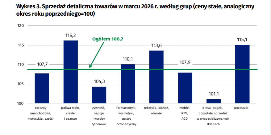 “Marcowe dane z handlu potwierdzają, że konsumpcja w dalszym ciągu pozostaje kołem zamachowym polskiej gospodarki, chociaż spowolnienie tempa wzrostu realnych dochodów do dyspozycji oraz niepewność związana z konfliktem na Bliskim Wschodzie, mogą nieco ograniczyć skłonność gospodarstw domowych do zakupów w dalszej części roku” – przekazał Antoniak.