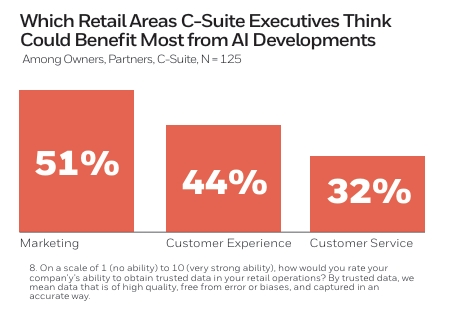 Podobne priorytety wskazuje także kadra kierownicza wyższego szczebla. Największy potencjał sztucznej inteligencji dostrzegają oni w marketingu (51%), na drugim miejscu w doświadczeniu klienta (44%), a na trzecim w obsłudze klienta (32%).
