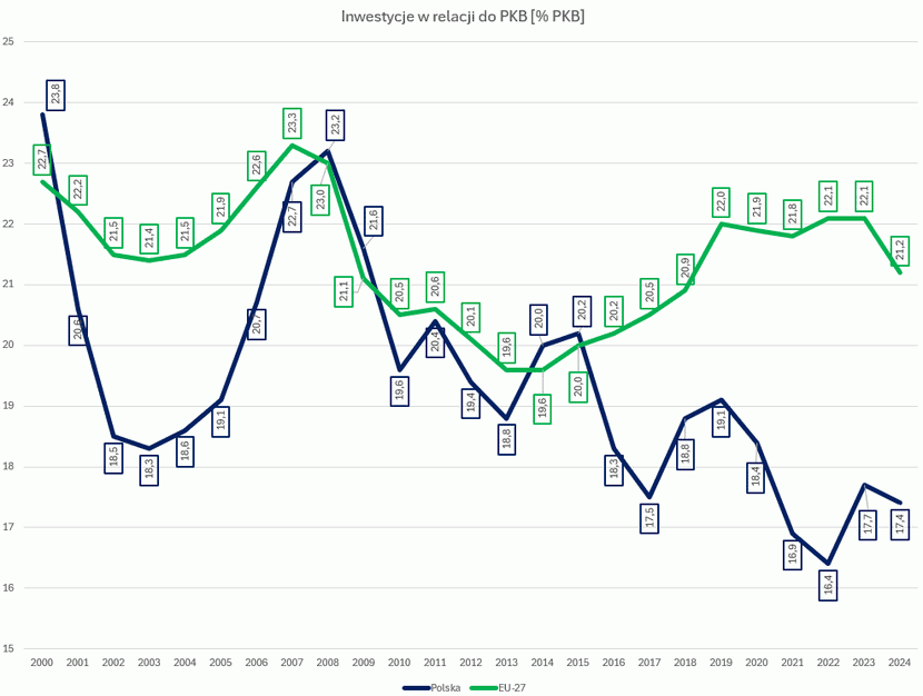 Z perspektywy dalszego rozwoju, szczególnie martwiący jest poziom inwestycji. Z roku na rok inwestujemy coraz mniej i pozostajemy na poziomie o 3,8 pkt proc. niższym, niż średnia europejska. “W zestawieniu 27 krajów UE Polska ląduje na 25 pozycji pod względem udziału inwestycji w PKB” – komentowali rozmówcy.