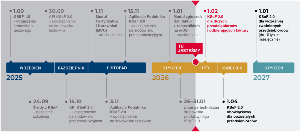 1 lutego 2026 – obowiązkowe wystawianie e-faktur dla dużych firm (obrót powyżej 200 mln zł w 2024 r.).