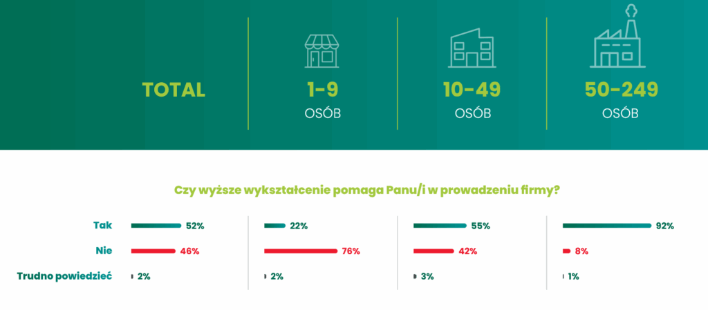 “To znaczenie studiów rośnie wraz z wielkością firmy. Podczas gdy tylko 17% właścicieli mikrofirm uważa, że studia odegrały ważną rolę w ich biznesie, wśród zarządzających firmami średniej wielkości ten odsetek sięga aż 89%. Podobnie z wiedzą ze studiów, gdzie 78% właścicieli średnich przedsiębiorstw twierdzi, że pomaga im ona skutecznie rozwijać firmę, w porównaniu do jedynie 21% w mikrofirmach” – tłumaczą autorzy badania.