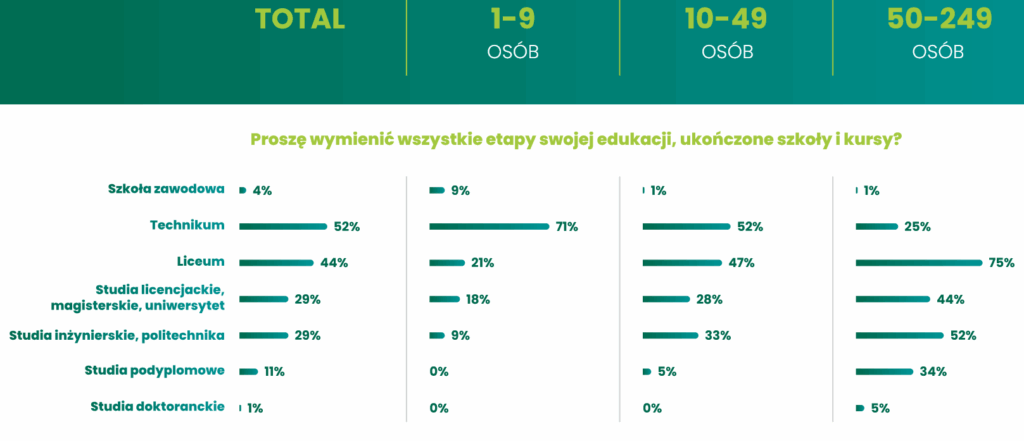 Właściciele mikroprzedsiębiorstw (od 1 do 9 osób zatrudnionych), w większości kończą swoją edukację na poziomie technikum, a 21 proc. jako alternatywę wybrało liceum. Tylko 27 proc. zdecydowało się kontynuować edukację na studiach licencjackich, inżynierskich lub magisterskich. Co ciekawe, ani jeden ankietowany nie ukończył studiów podyplomowych lub doktoranckich.