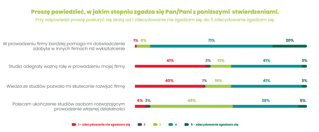 Właściciele firm pozostają mocno niezdecydowani co do wagi studiów w prowadzeniu firmy. Aż 41 proc. ankietowanych uważa, że studia nie odegrały ważnej roli w historii ich działalności, 44 proc. jest zdania przeciwnego. Bardzo podobnie odpowiedziano na temat przydatności wiedzy nabytej w rozwijaniu firmy (41 proc. uważa, że wiedza ze studiów nie pomogła im skutecznie rozwijać firmę, 44 proc. docenia rolę edukacji – pomogła im rozwinąć działalność).