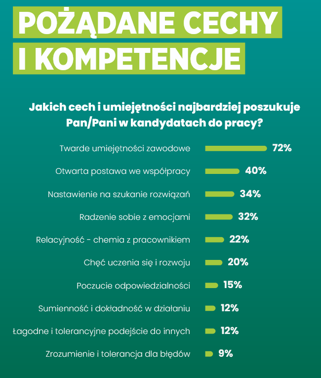Dużym problemem zaczyna być kwestia odporności psychicznej pracowników. Coraz więcej pracodawców wskazuje “radzenie sobie z emocjami” jako pożądaną cechę potencjalnego zatrudnionego. Co ciekawe “otwartą postawę we współpracy” i “nastawienie na szukanie rozwiązań”, jako cechy wysoko cenione, wskazują głównie firmy budowlane (57 proc. i 49 proc.) oraz handlowe (60 proc. i 50 proc.), w porównaniu do pozostałych branż (20-34 proc. proc.).