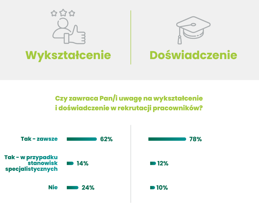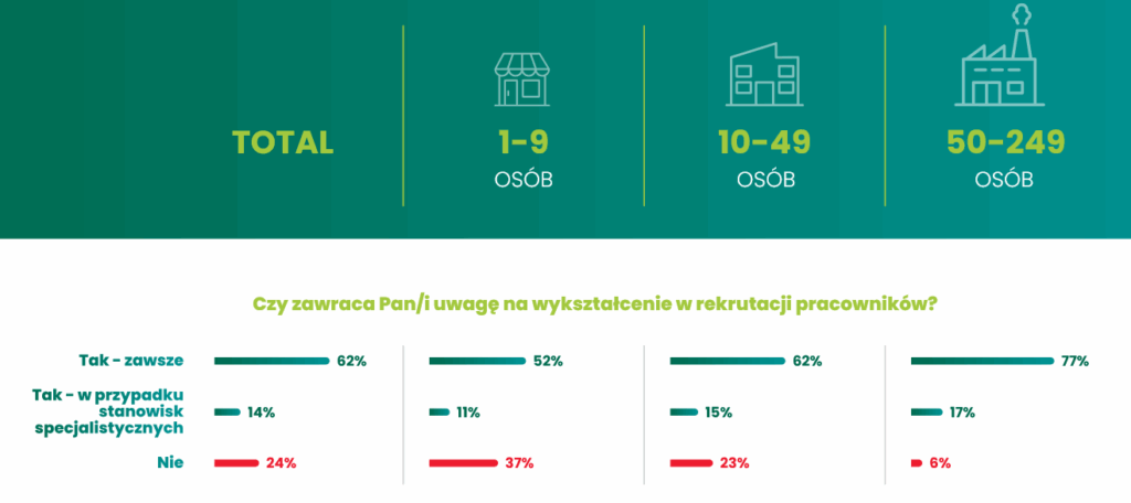 “Biorąc pod uwagę wielkość firmy, w mikroprzedsiębiorstwach (1–9 osób) rola wykształcenia jest najmniejsza. Ponad jedna trzecia firm nie bierze go w ogóle pod uwagę, a 52% zwraca uwagę zawsze. W średnich firmach wykształcenie ma największe znaczenie. Aż 77% firm zawsze bierze je pod uwagę, a dodatkowe 17% w przypadku stanowisk wymagających specjalistycznej wiedzy” – podsumowują autorzy badania.
