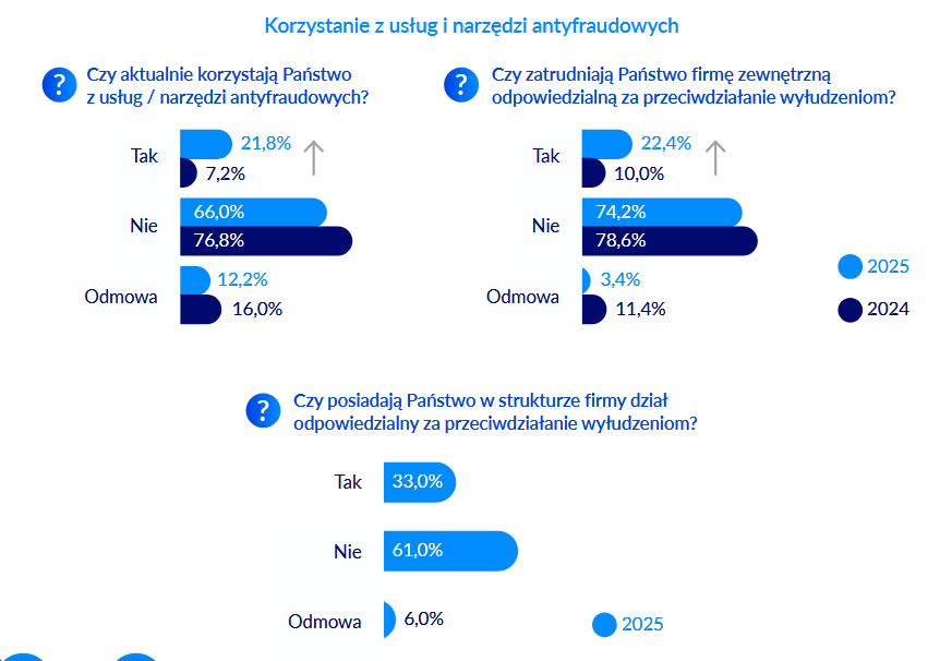 Nie tylko klienci indywidualni padają ofiarami “fraudów”. W 2025 r. styczność ze zdarzeniami fraudowymi miało 31,8% przedsiębiorców, “skali zjawiska nie determinują ani branża, ani wielkość firmy — zagrożone są wszystkie podmioty” – czytamy w raporcie. Łącznie aż 34 proc. przedsiębiorców wskazuje, że ich firmy stały się celem cyberataków.