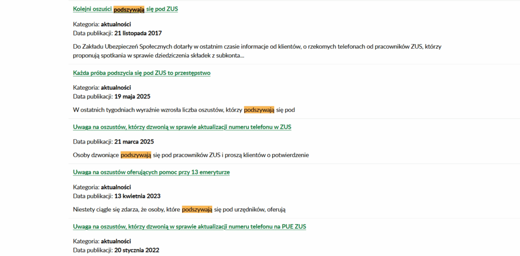 ZUS systematycznie przypomina swoim klientom o ryzyku ataku phishingowego. Instytucja cieszy się popularnością wśród oszustów, którzy bardzo chętnie podszywają się pod pracowników zakładu, w celu wyłudzenia. W samym roku 2025, ZUS opublikował 3 komunikaty ostrzegawcze.