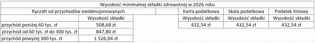 Przedsiębiorcy nie korzystający z ulg muszą płacić składki których minimalna podstawa wynosi 60% prognozowanego przeciętnego wynagrodzenia miesięcznego brutto. Według obliczeń, w 2026 roku składki w wysokości standardowej wyniosą łącznie 1926,76 złotych, na co składa się: